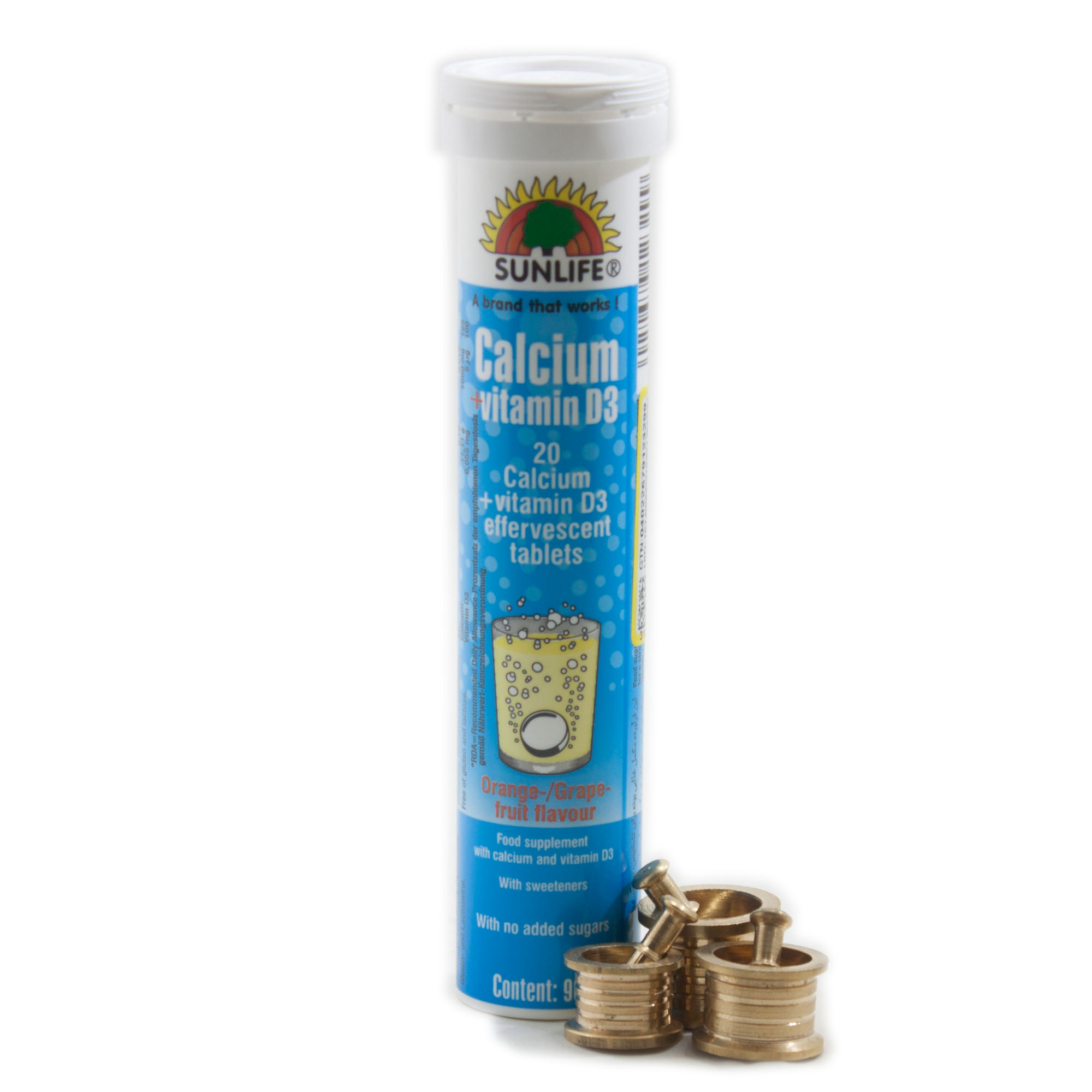 قرص جوشان کلسیم +ویتامین D3 سان لایف با طعم پرتقال و گریپ فروت است. (Serving Size) که شامل 2 قرص جوشان میباشد حاوی 1000 میلی گرم کلسیم و 5 میکروگرم ویتامین D میباشد.